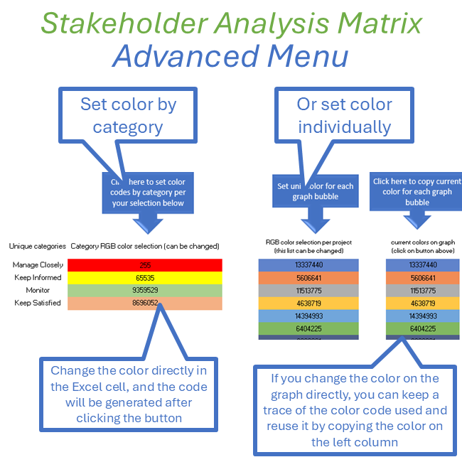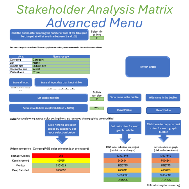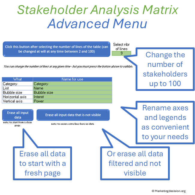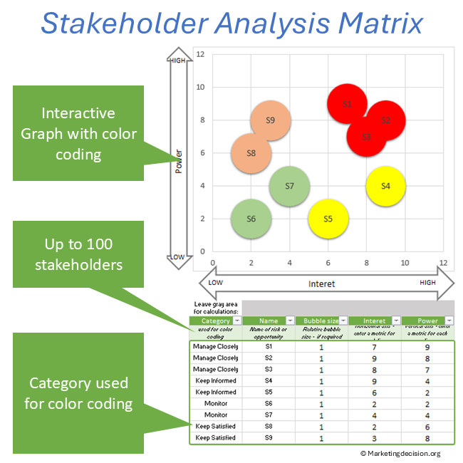 The proposed Excel tool is based on a two-dimensional graph that captures two key dimensions: interest and power or influence. These axes help identify the relative power of each stakeholder and serve as a key tool for development teams to determine strategy, facilitate discussions, and take action.
