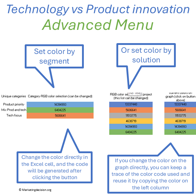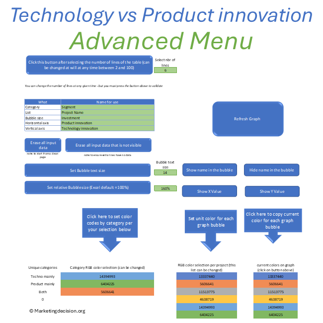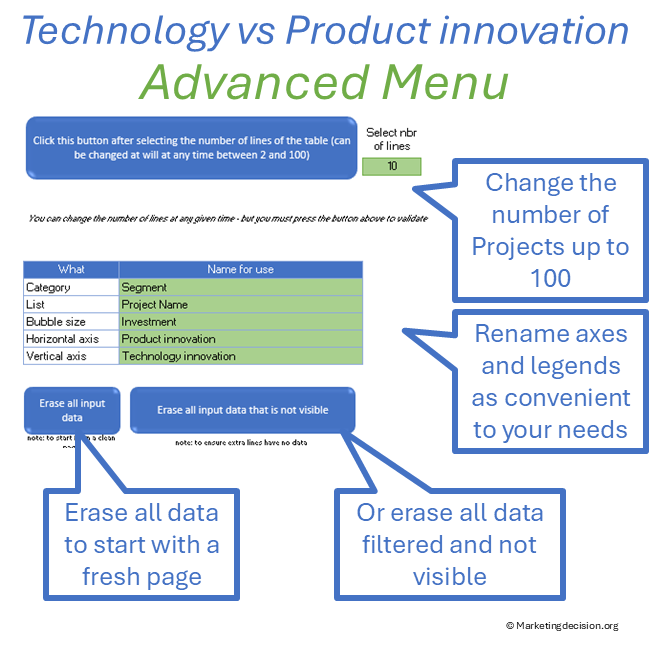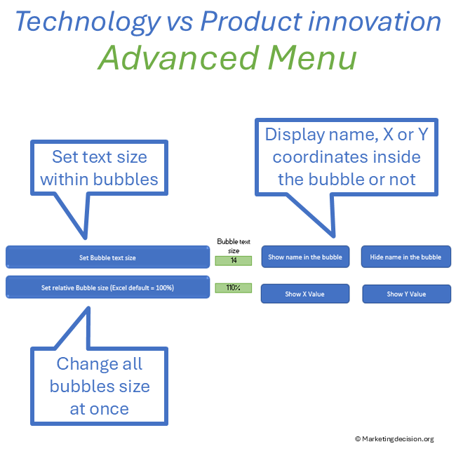 The proposed Excel tool is essential for visualizing technology and product innovation paths and supporting team discussions on the best approaches to innovation. It uses two axes to represent the degree of technology and product innovation required to achieve new levels of competitiveness. Products can be displayed on the graph to highlight the level of difficulty resulting from the combination of product and technology innovations. The size of each bubble can represent the relative level of investment.