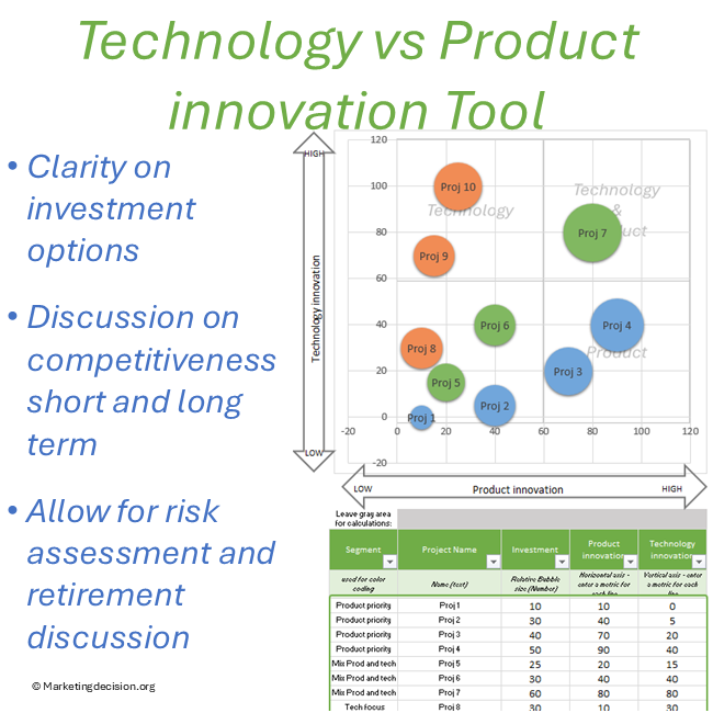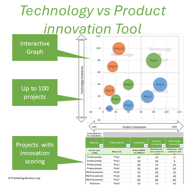 The Technology vs Product Innovation Tool is an Excel matrix designed to help teams compare innovation options, balance strategic priorities, and support development decisions.