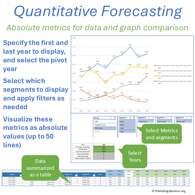 This tab is highly versatile, allowing all metrics to be displayed on the same graph. The approach involves analyzing variations introduced by each metric, using a specific year – referred to as the “current year” – as the pivot year. All metrics can be displayed, and a weighted sum can be calculated to generate an average forecast by applying selected weighting factors.