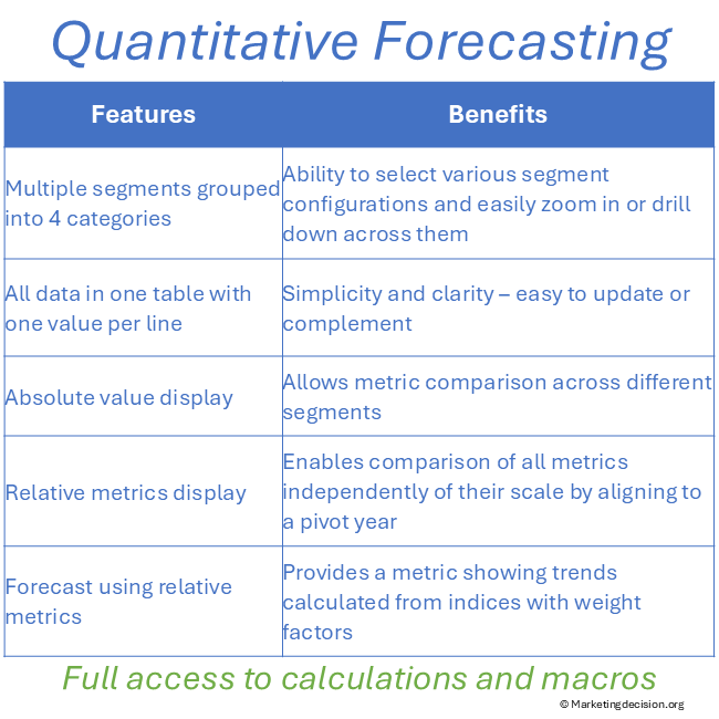 Quantitative forecasting aims to quantify market trends and assess, for instance, the growth or decline of specific market segments on a yearly basis. These techniques typically leverage quantitative data from multiple sources, including public and private institutions (such as the OECD and industry associations), to analyze historical data and generate future trend estimates.