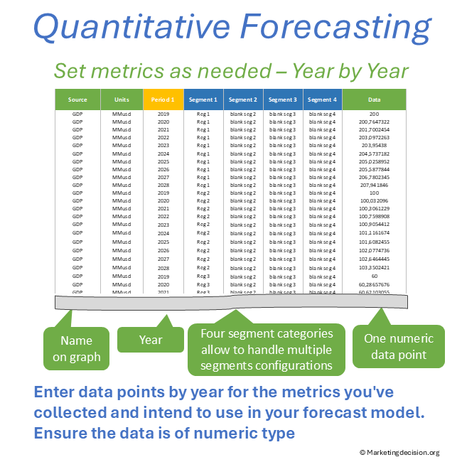 The organization of the data is with a single data point for a metric, a segment and a year by row. This allows additional data to be added gradually. For calculation purposes such metrics should be additive such as population and market volume. It is not recommended to use ratio or growth rates that cannot be added across multiple segments when absolute values can be.